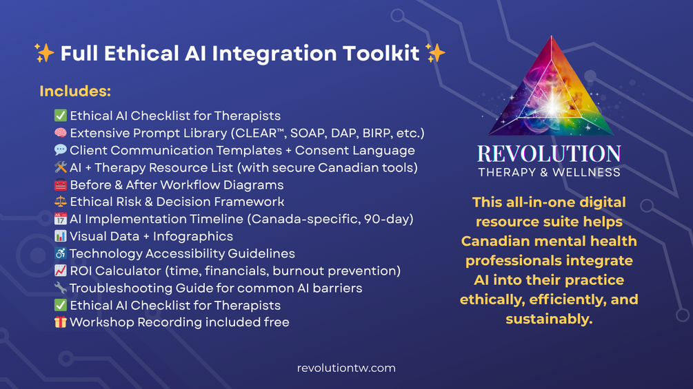 💼 Ethical AI Integration Toolkit The go-to resource for ethically aligned AI use in Canadian mental health practice. This professionally curated Toolkit includes everything you need to integrate AI into your clinical workflow—ethically, sustainably, and in full compliance with Canadian privacy laws and regulatory standards.